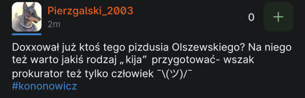 Niecałe pół godziny później, Wójcik - ponownie za pośrednictwem profilu na x - potwierdził najgorsze przypuszczenia widzów Uniwersum: „Sprawa Kononowicza oficjalnie umorzona”. Rozwiń wpis Uruchomiło to lawinę komentarzy pod wieloma adresami, skutkując lajtem „pożegnalnym” Olgierdano, słowami otuchy w jego kierunku, ale też szyderczymi opiniami, wyśmiewającymi jego pychę.