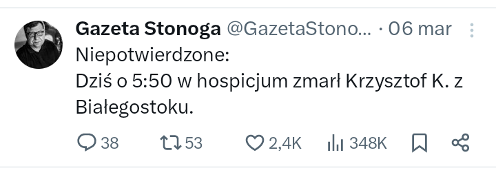 Słowem wstępu, podczas trudnej hospitalizacji, zapoczątkowanej 25 grudnia 2024 roku, Kononowicz w końcu został przetransportowany do hospicjum, w którym przeżył 17 kolejnych dni. Zaledwie 2 dni przed przeniesieniem, Piotr z Warszawy odwiedził Ksieka w szpitalu, dzięki czemu widzowie Uniwersum mieli w końcu wgląd w faktyczną sytuację związaną z prawdziwym stanem zdrowia Gospodarza domku drewnianego, bowiem do tej pory Mleczna Ekipa przekonywała wszystkich, że z Krzyśkiem jest coraz lepiej, a nawet, że pacjent zaczął dokazywać i bić pielęgniarki (Doniesienia z dnia 6 lutego 2025 r.). Piotr odwiedził Kononowicza niecałe 10 dni później (15 lutego 2025 r.) i skwitował jego stan słowem „tragedia”, co udowodnił poprzez publikację zdjęcia ze szpitala. Chaosowi informacyjnemu nie było końca, bowiem jak tylko społeczność obiegła informacja o zaplanowanym transporcie do hospicjum, to na kanale Mleczny Człowiek pojawił się ironiczny wpis, świadczący o tym, że nie jest to prawda17). Niedługo później wpis usunięto.
