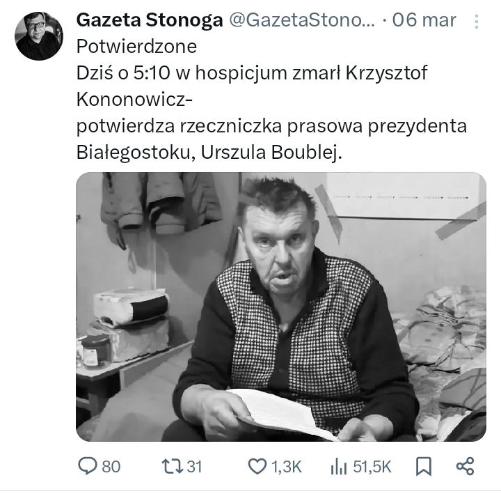 6 marca 2025 roku Zbigniew Stonoga oraz Olgierdano od rana informowali o tym, że Kononowicz nie żyje. Informacja ta nie była jednak potwierdzona. Ostatecznie, w okolicach godziny 14:00 wiadomość została potwierdzona przez rzeczniczkę prasową prezydenta Białegostoku- Urszulę Boublej. Stonoga, nie zwlekając, opublikował kolejny post