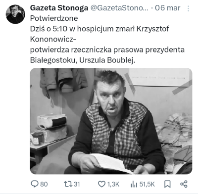 Śmierć Krzysztofa Kononowicza - 6 marca 2025 roku Krzysztof Kononowicz opuścił ziemski padół, umierając samotnie w hospicjum przy ulicy Sobieskiego w Białymstoku, gdzie został przetransportowany w czasie hospitalizacji podczas drugiej afery szpitalnej.